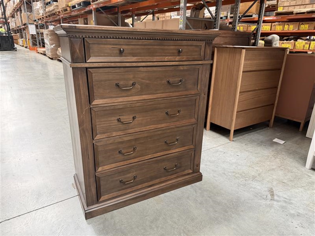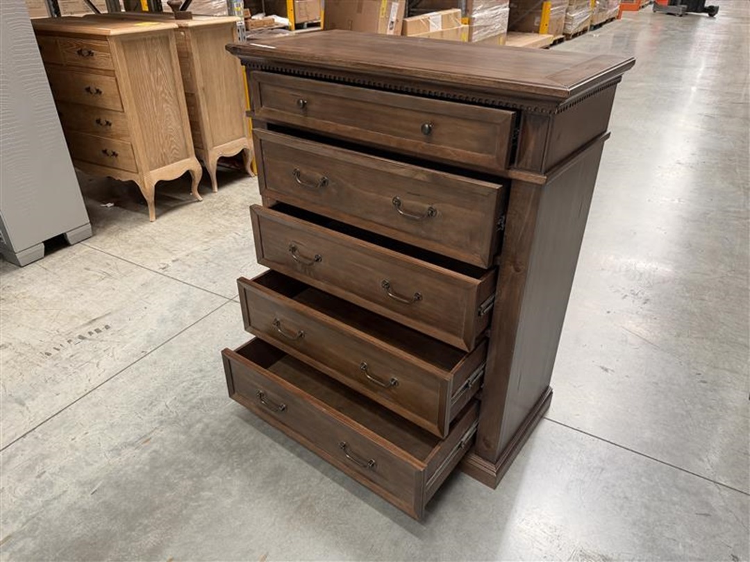 Crafted from rich chocolate-finished timber, this tallboy offers five spacious drawers for all your storage needs. The timeless design and sturdy build add warmth and elegance to your bedroom.