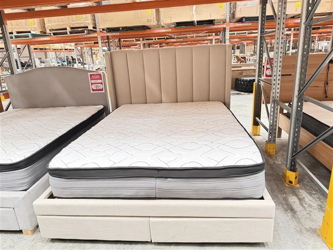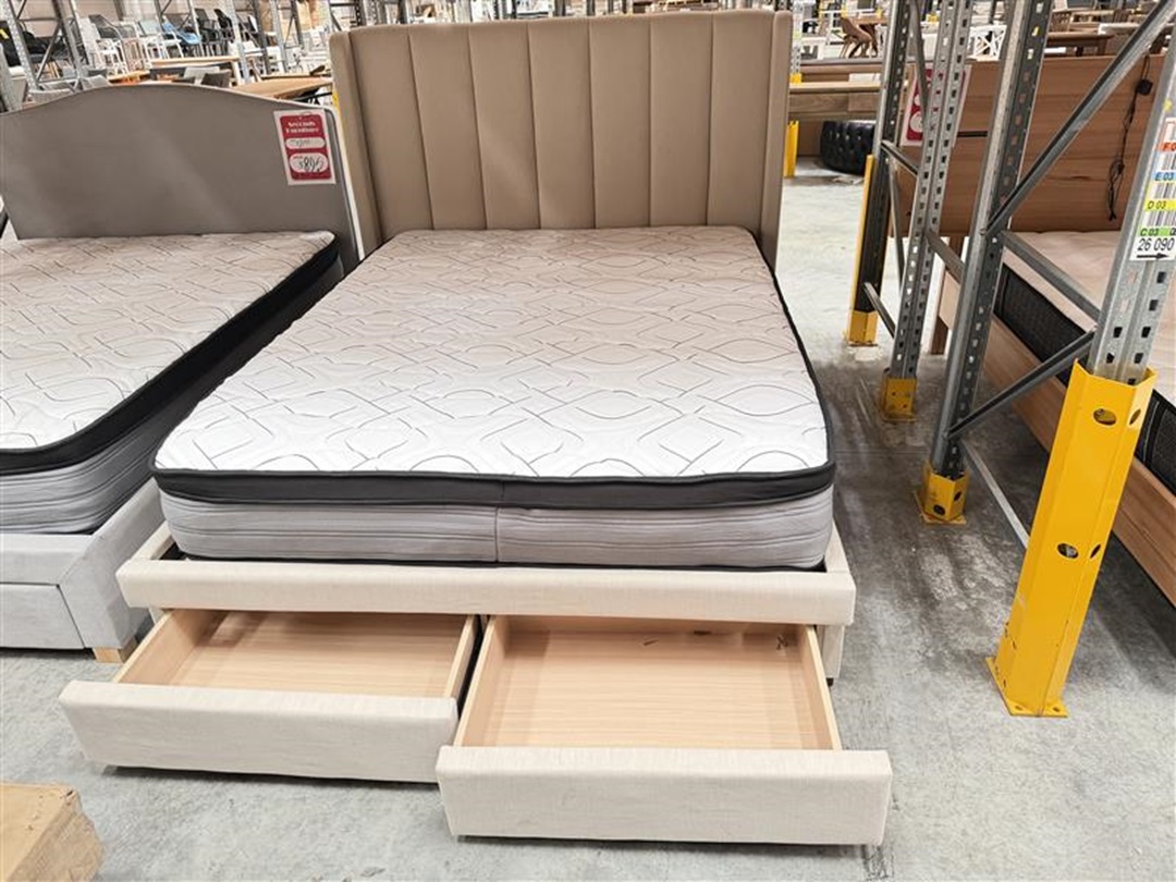 Elegant and practical, this queen bed is upholstered in soft light beige fabric with two under-bed drawers for convenient storage. Its neutral tone complements any bedroom décor. Built for comfort and functionality.