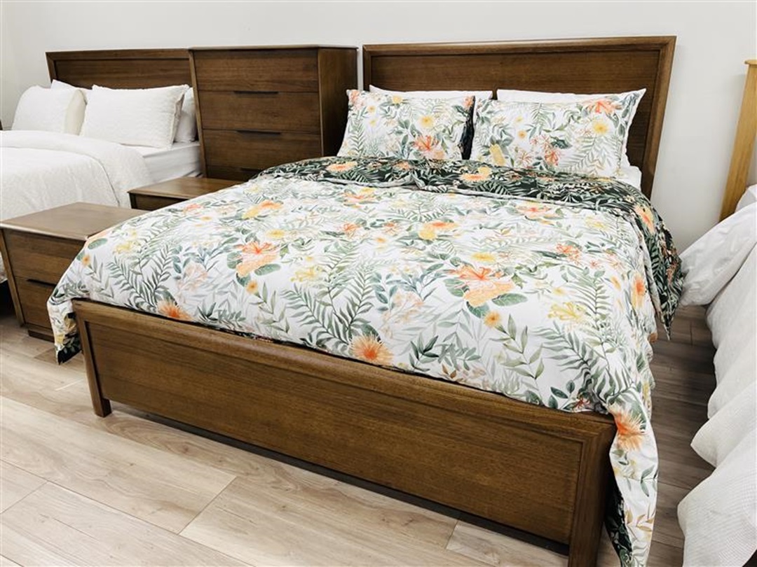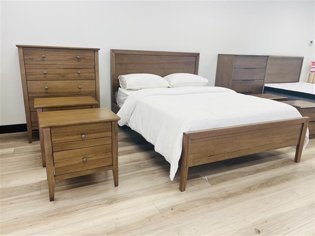 Stylish and sturdy, this 4-piece queen suite features a bold dark smoke timber finish. The set includes a queen bed, two bedside tables, and a tallboy, delivering a modern and moody aesthetic for sophisticated bedrooms.