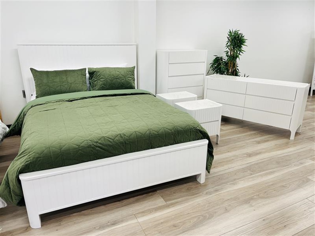 This elegant 5-piece bedroom package features a queen bed, bedside tables, tallboy, and dresser in a crisp white finish. Designed for both style and storage, it creates a fresh and serene look. A complete solution for modern and timeless interiors.