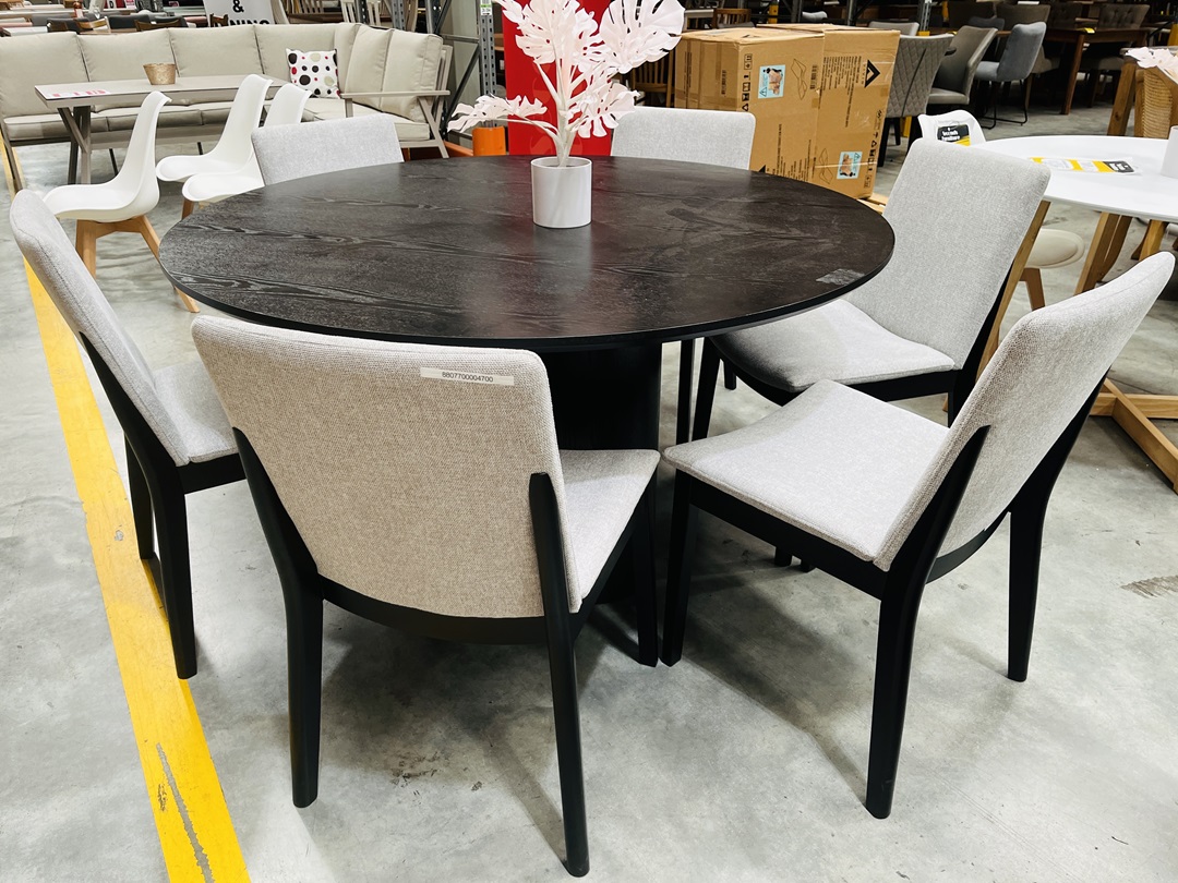 This elegant dining set includes a black timber round table and six grey fabric chairs. The dark finish contrasts beautifully with the soft, neutral seating. A stylish centerpiece for gatherings and meals.