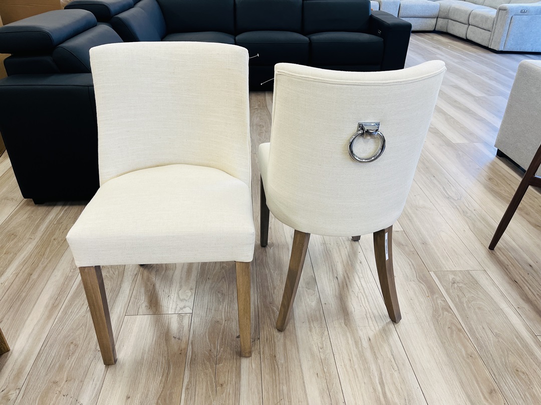 With a timeless cream fabric finish, this chair blends seamlessly into any dining room décor. The elegant ring handle on the back offers a refined accent. Stylish and comfortable for everyday dining or entertaining.