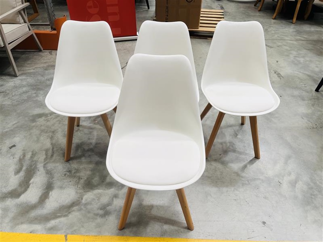 A modern dining chair combining a white seat with natural timber legs. Its clean design fits seamlessly into any dining space. Comfortable and versatile for everyday use.
