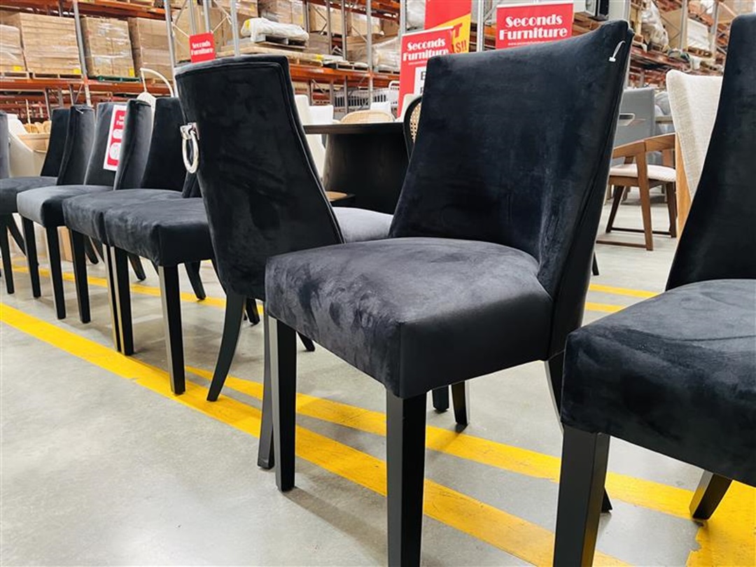 Sophisticated and chic, this dining chair is upholstered in plush black velvet. The elegant ring handle on the backrest adds a refined touch. A perfect blend of comfort and luxury for formal dining.