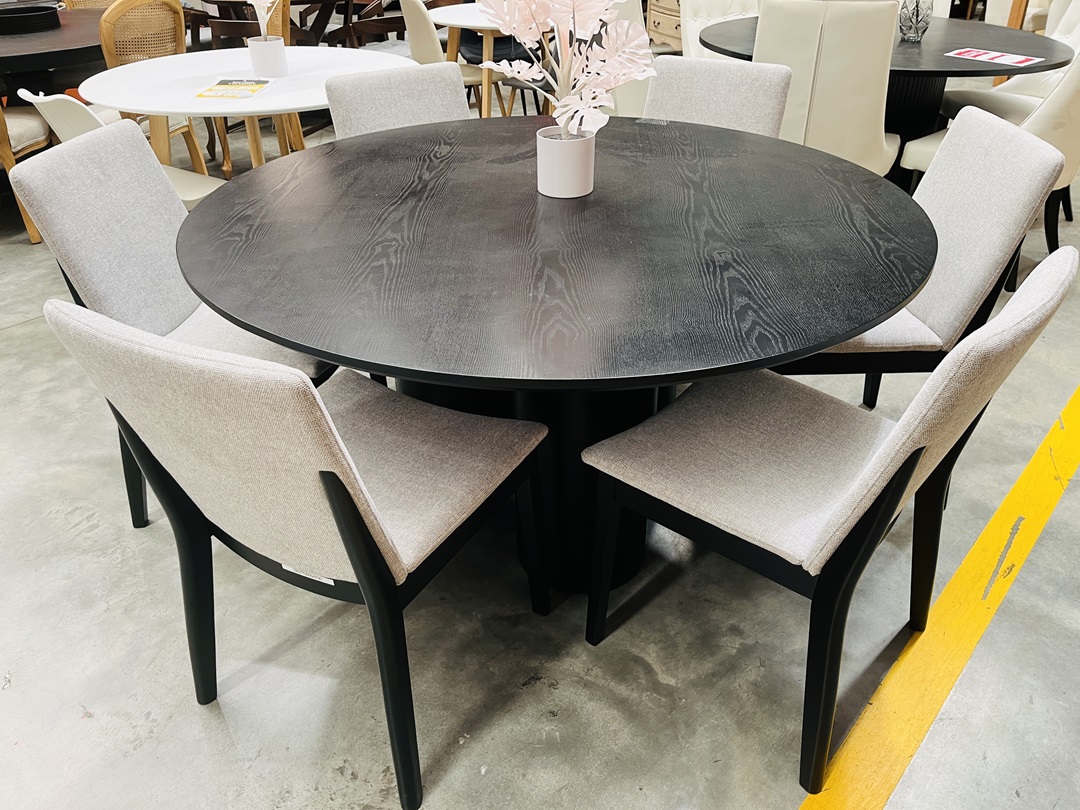 This elegant dining set includes a black timber round table and six grey fabric chairs. The dark finish contrasts beautifully with the soft, neutral seating. A stylish centerpiece for gatherings and meals.