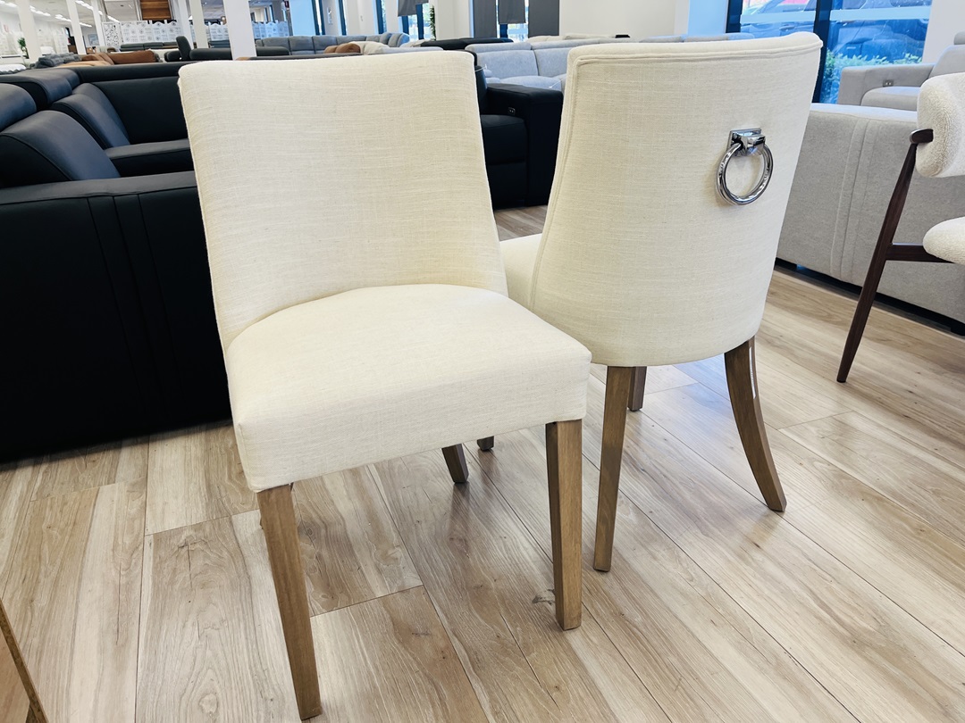 With a timeless cream fabric finish, this chair blends seamlessly into any dining room décor. The elegant ring handle on the back offers a refined accent. Stylish and comfortable for everyday dining or entertaining.