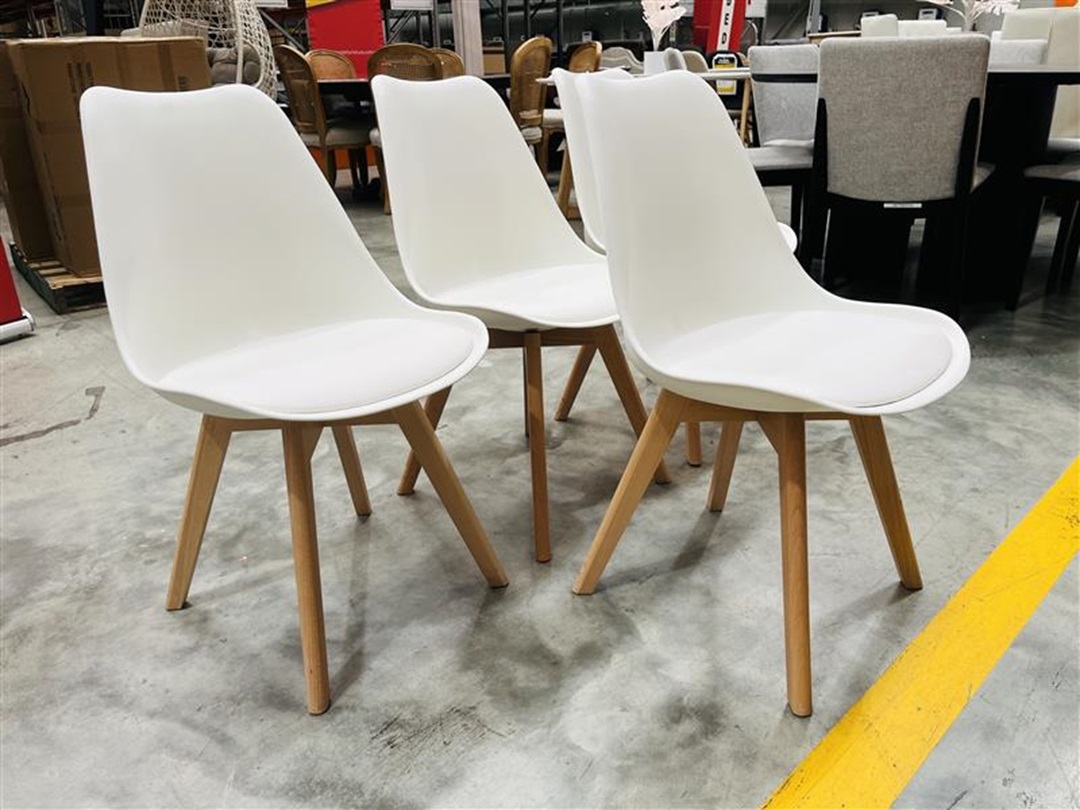 A modern dining chair combining a white seat with natural timber legs. Its clean design fits seamlessly into any dining space. Comfortable and versatile for everyday use.