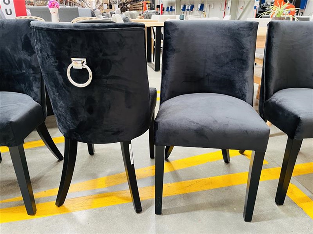 Sophisticated and chic, this dining chair is upholstered in plush black velvet. The elegant ring handle on the backrest adds a refined touch. A perfect blend of comfort and luxury for formal dining.
