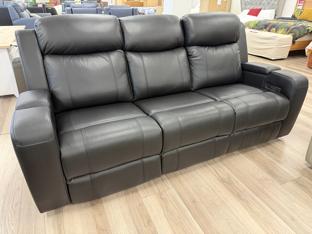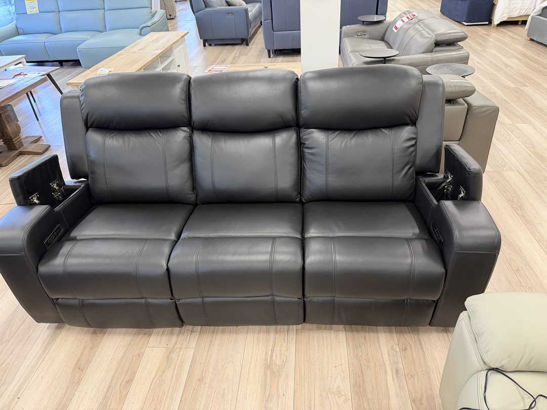 A premium black leather 3 seater sofa designed with electric recliners, built-in USB port, dropdown tray, and hidden storage to deliver advanced comfort and everyday convenience.