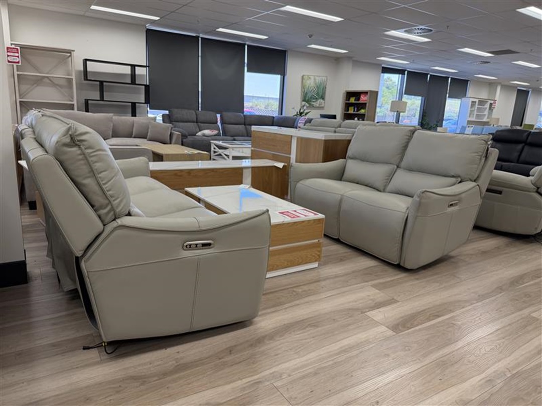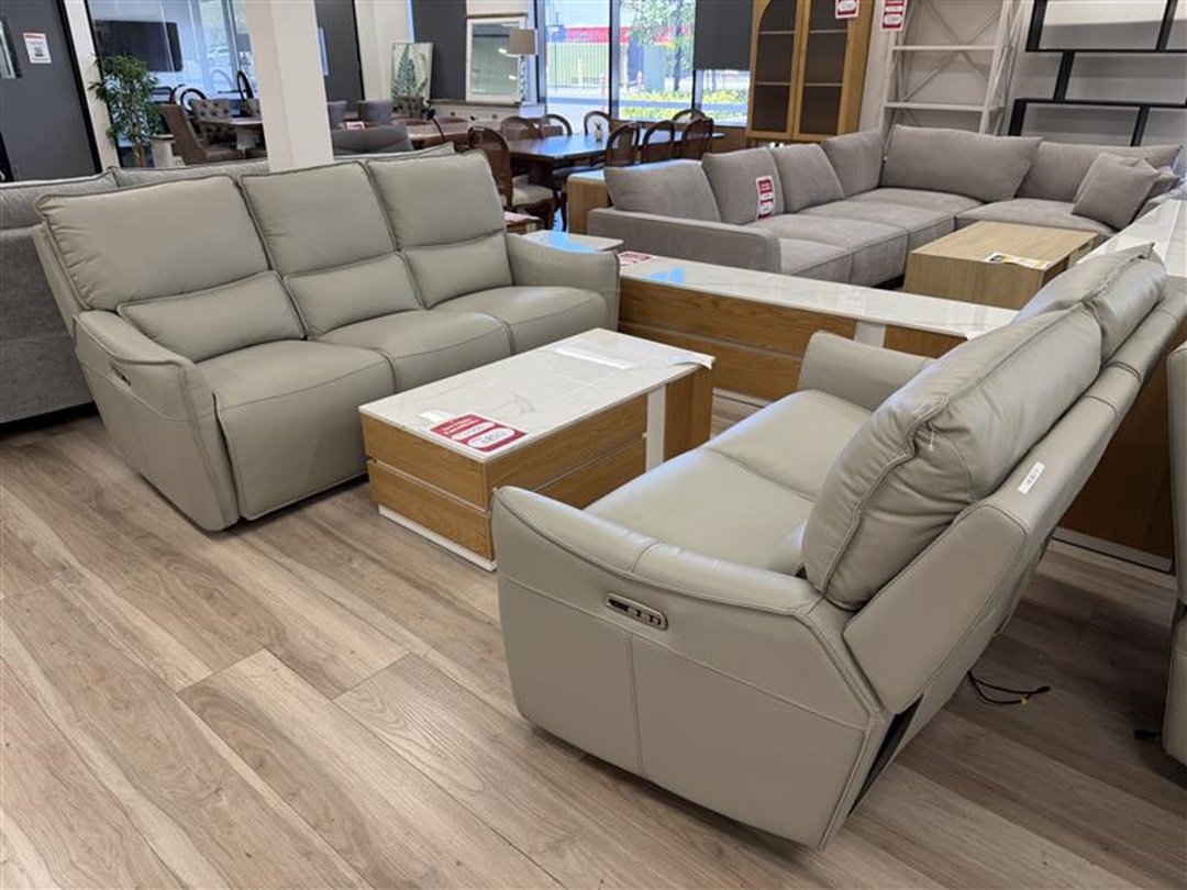 A luxurious 3+2 sofa set upholstered in silver grey leather that features smooth electric reclining functions for ultimate comfort and modern living room style.