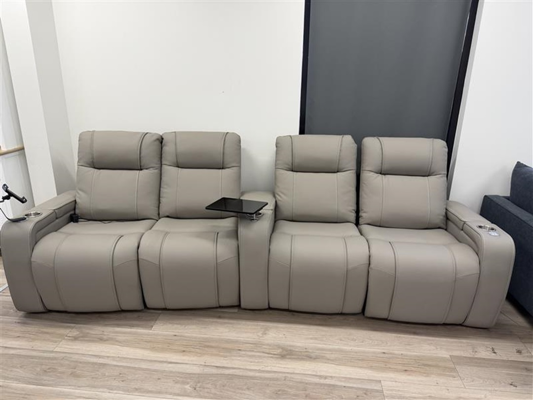 A luxurious home theatre seating system upholstered in soft taupe leather that includes electric reclining, an extra recliner seat, and built-in massage functionality for premium relaxation.