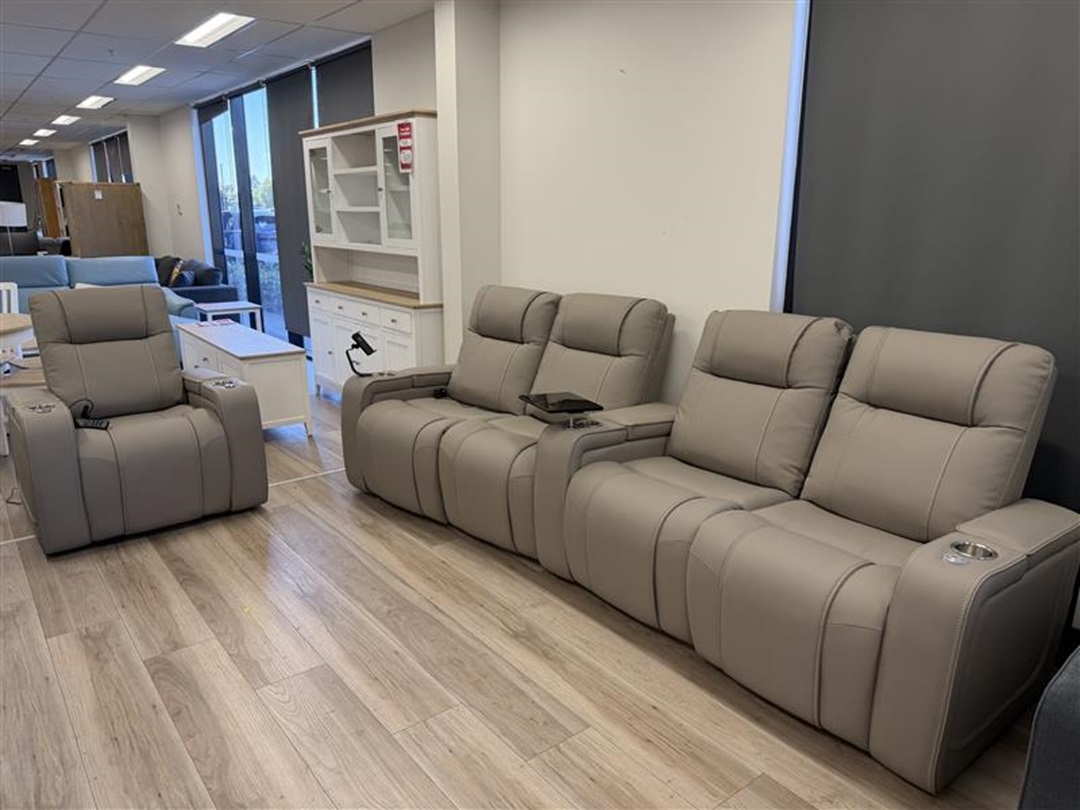 Taupe Leather Electric Home Theatre with extra Recliner and built in Massage Feature
