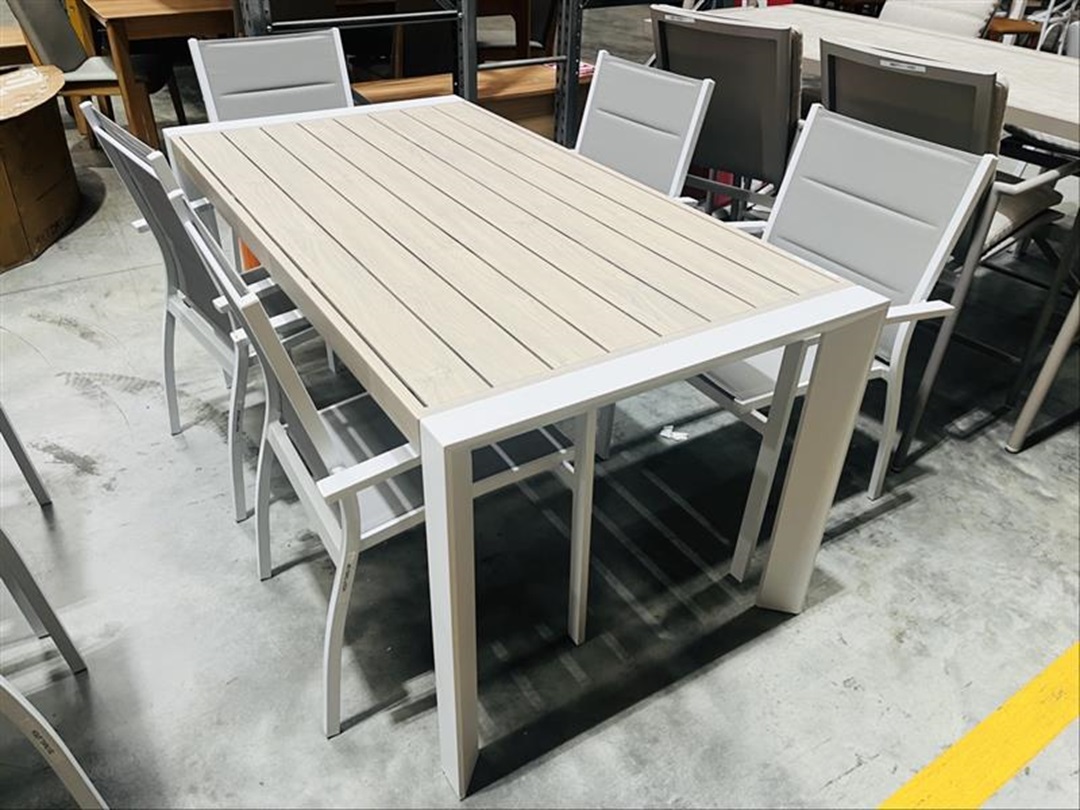 This 7-piece outdoor dining set includes a spacious table with six beige and white chairs. Designed for durability and style, it’s perfect for open-air dining and entertaining.