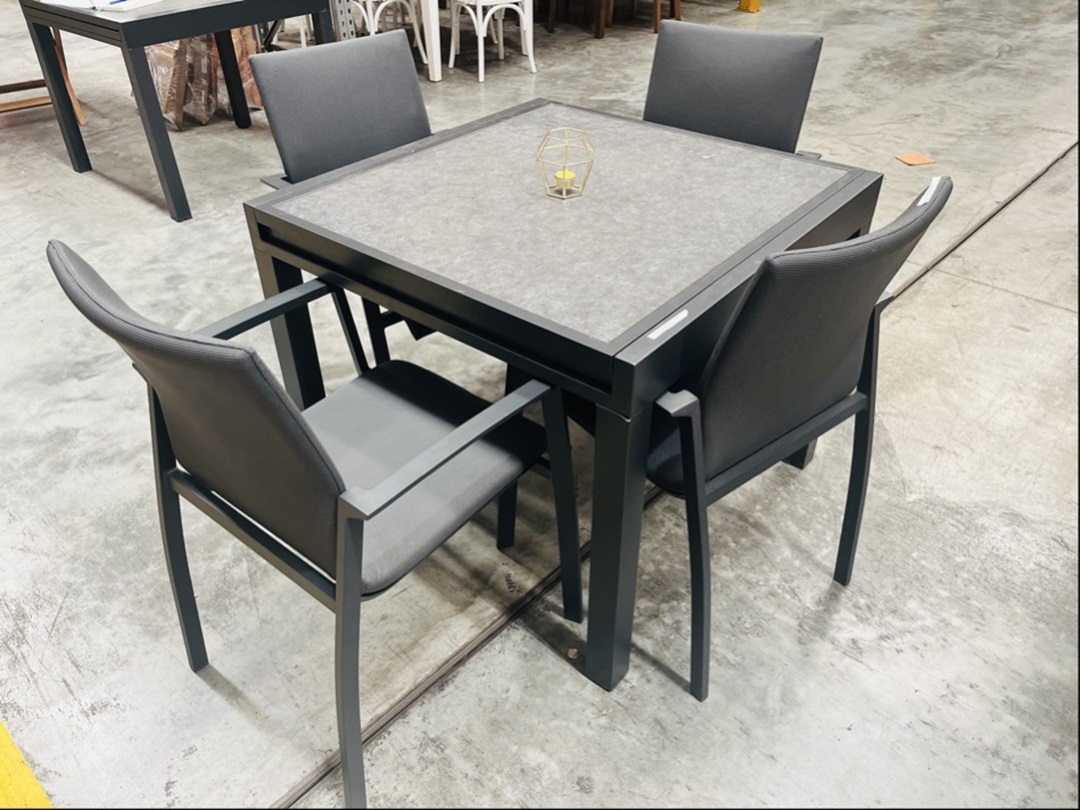 A versatile 5-piece outdoor set featuring a square dark grey extension table and four matching chairs. Built with weather-resistant materials for long-lasting outdoor enjoyment.