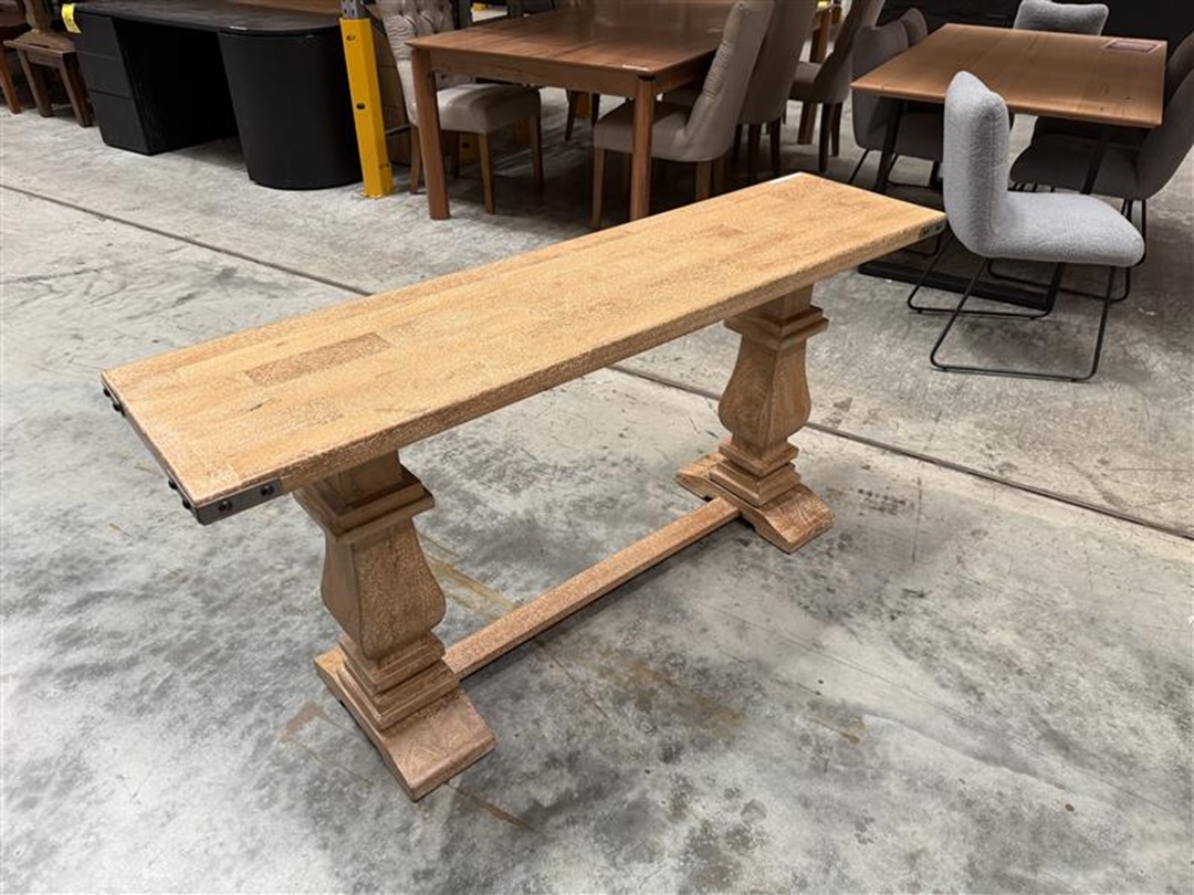A beautifully crafted 160cm hall table in a honey wash finish. Features a classic pedestal base, making it a standout statement piece for entryways and living spaces.