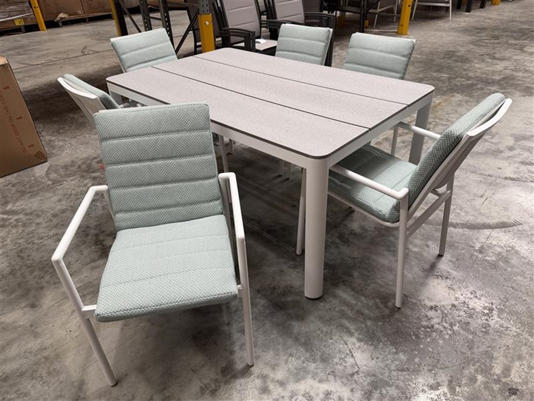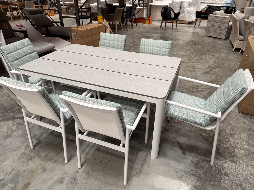 A spacious 160cm outdoor dining table paired with six matching chairs designed to provide durable, weather-resistant comfort for patios, gardens, and alfresco areas.
