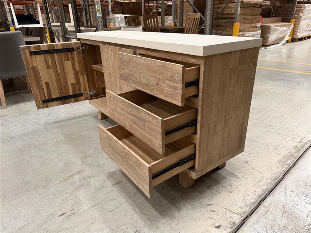 A stylish timber buffet featuring two doors and three drawers topped with a durable concrete surface that combines practicality with a bold contemporary look.