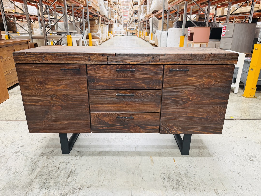 This natural timber buffet offers three doors and three open niches for storage and display. Supported by strong black metal legs, it delivers a modern industrial feel. A practical and stylish addition to dining or living spaces.