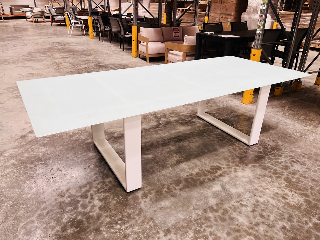 A sleek and modern 260cm outdoor table crafted from durable aluminium with a tempered glass top. Spacious design ideal for large gatherings. Combines strength and sophistication for outdoor living spaces.