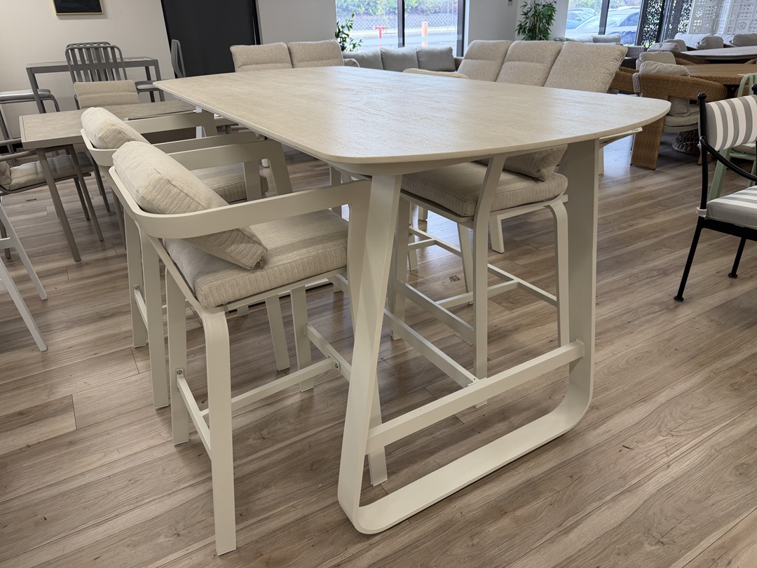A chic and spacious nine-piece outdoor setting featuring a large white dining table and eight matching chairs. Perfect for al fresco dining with family and friends in a bright, modern setting.