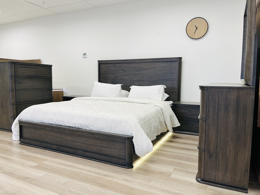 A modern queen bed upholstered in soft light grey fabric, featuring a padded headboard for comfort and style. Its neutral color and sleek design make it a versatile choice for contemporary bedrooms.