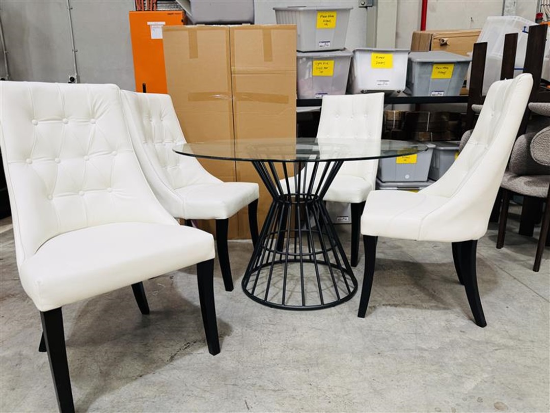 The 5pc Round Dining Set with Glass Table & White Leather Chairs combines a sleek glass tabletop with comfortable white leather chairs, creating a bright and elegant dining setting ideal for everyday use or entertaining.