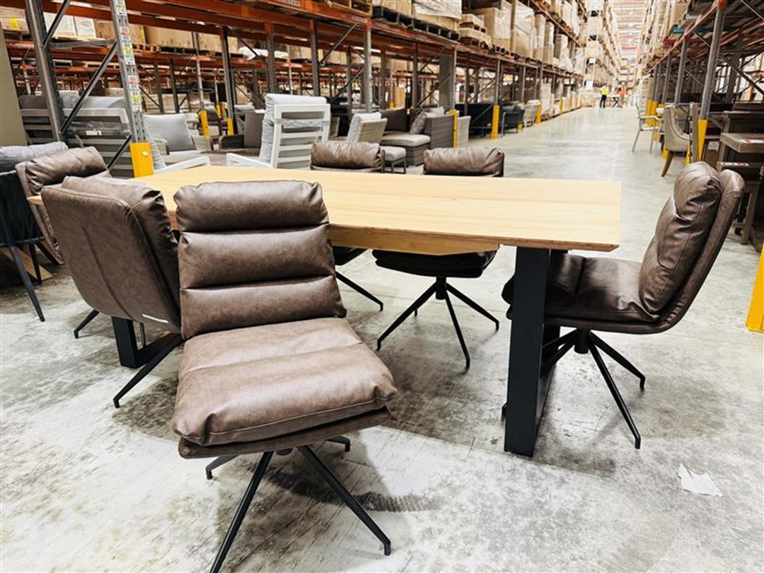 A sophisticated dining set including a spacious table paired with six comfortable brown leather chairs. Designed for both everyday dining and entertaining, offering durability, comfort, and timeless appeal.