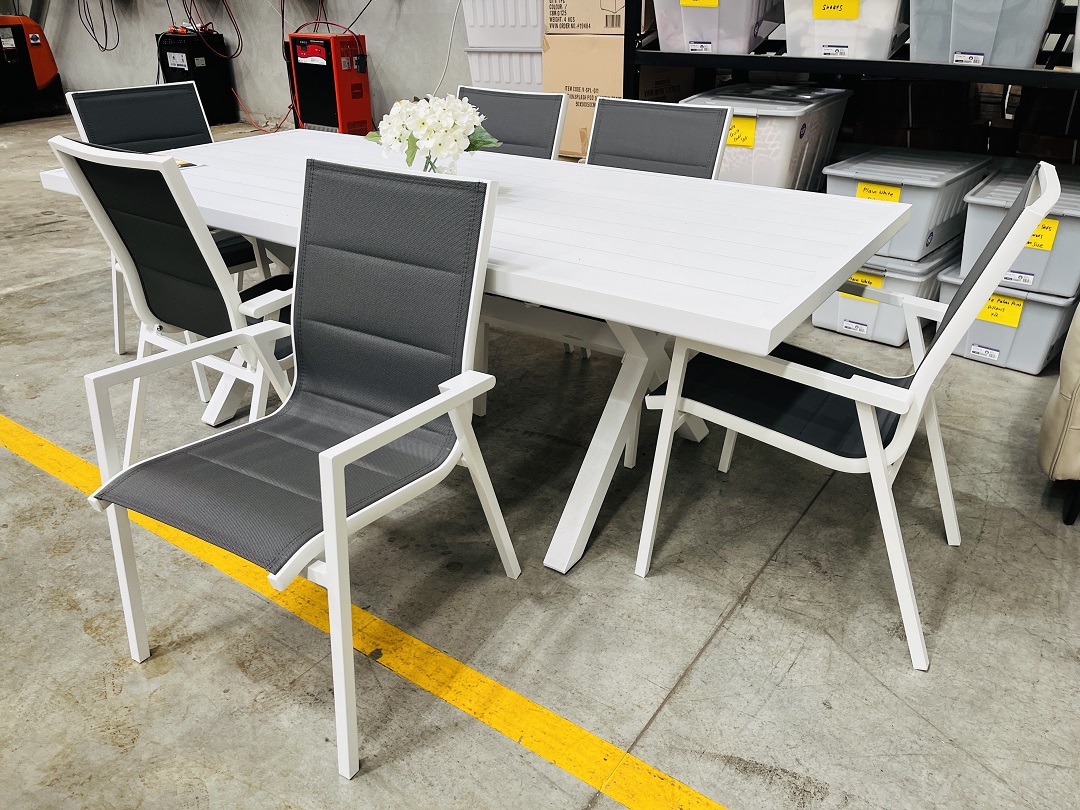 This 7-piece outdoor dining set combines a fresh white and dark grey color scheme, perfect for outdoor entertaining. The durable materials ensure long-lasting style and comfort for your patio or garden.