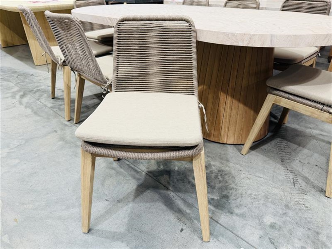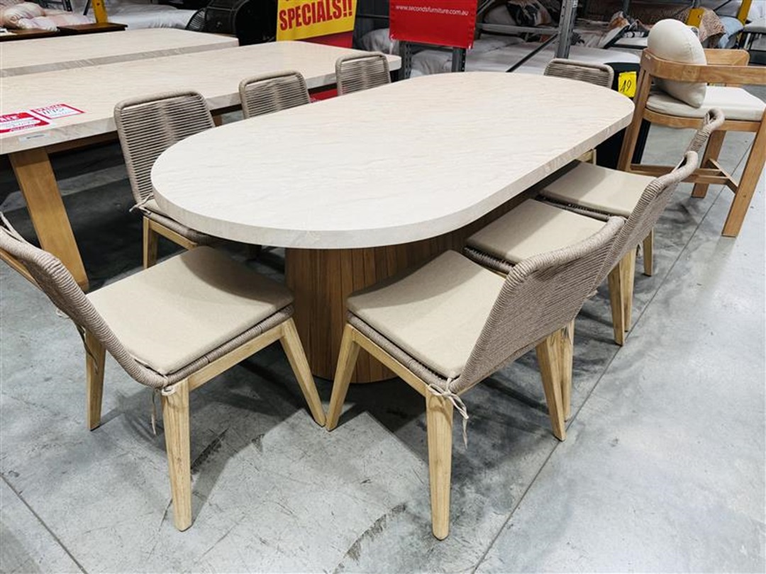 Ideal for outdoor entertaining, this dining setting features a strong cement top table paired with eight stylish rope chairs. Combining durability with modern design, it creates a relaxed and contemporary alfresco dining experience.