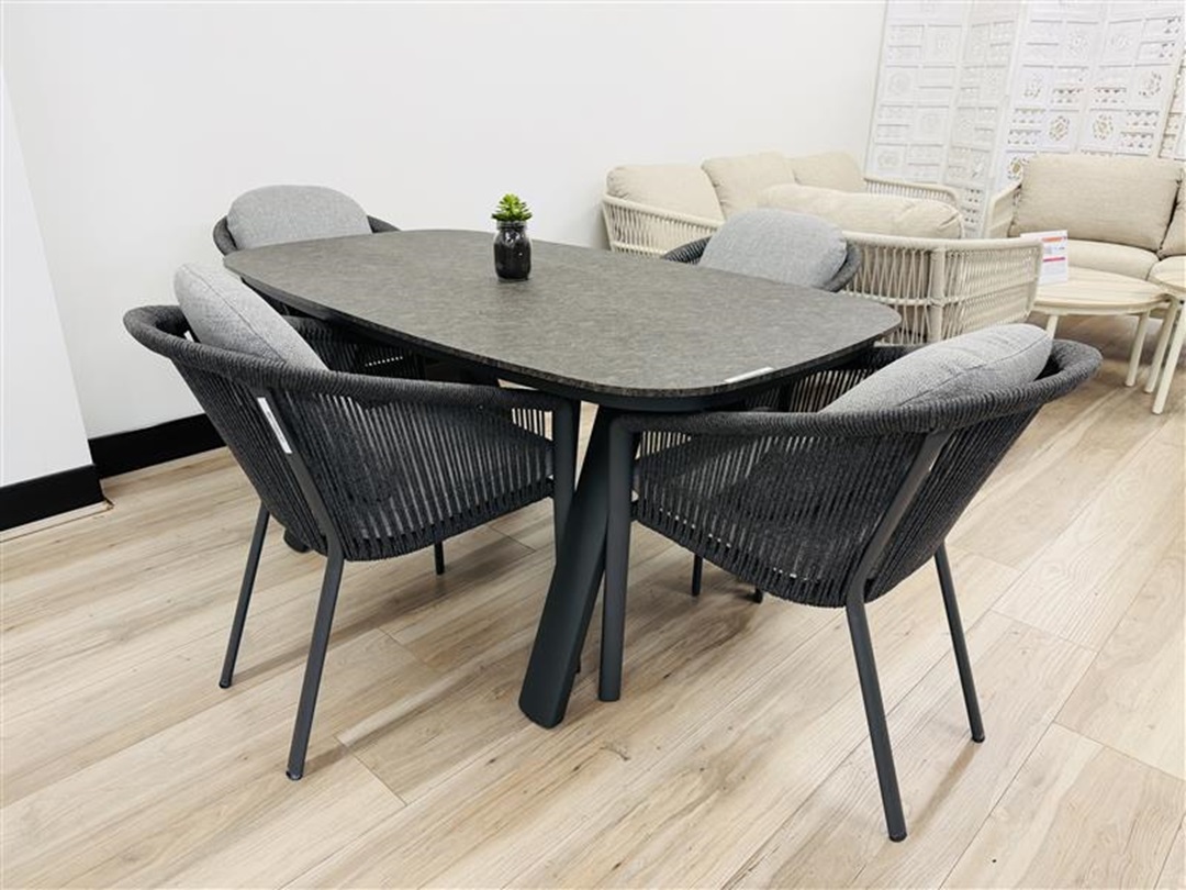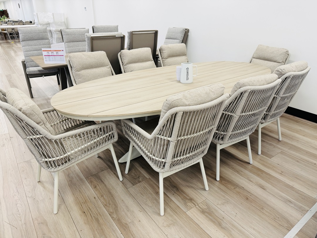 The 9pc Outdoor Dining Setting with Matching Rope Chairs blends durable outdoor materials with stylish rope-back chairs, offering comfortable seating and a contemporary look for alfresco dining.