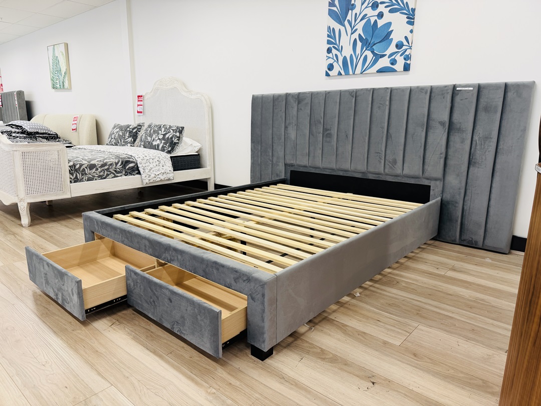 This upholstered bed features a contemporary stone grey fabric finish, ideal for a neutral or minimalist bedroom theme. The integrated drawers provide smart, space-saving storage for linens, clothing, or seasonal items.
