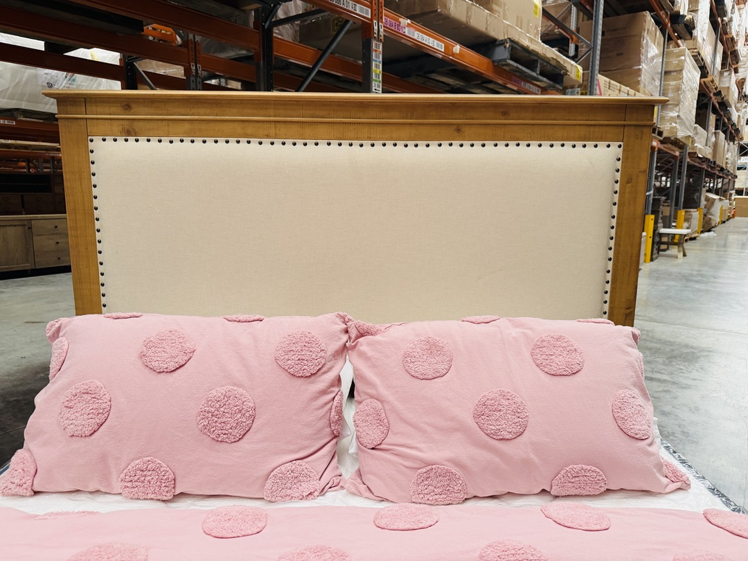 A timeless queen bed crafted in an antique natural timber finish, featuring a soft upholstered fabric headboard for added comfort and elegance. Perfect for creating a warm and inviting bedroom atmosphere.