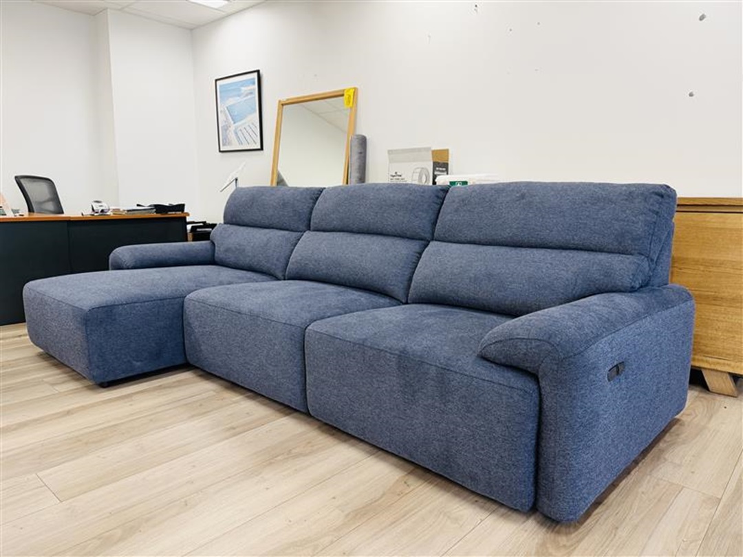 A luxurious blue leather chaise lounge featuring an integrated electric recliner for ultimate comfort and relaxation.