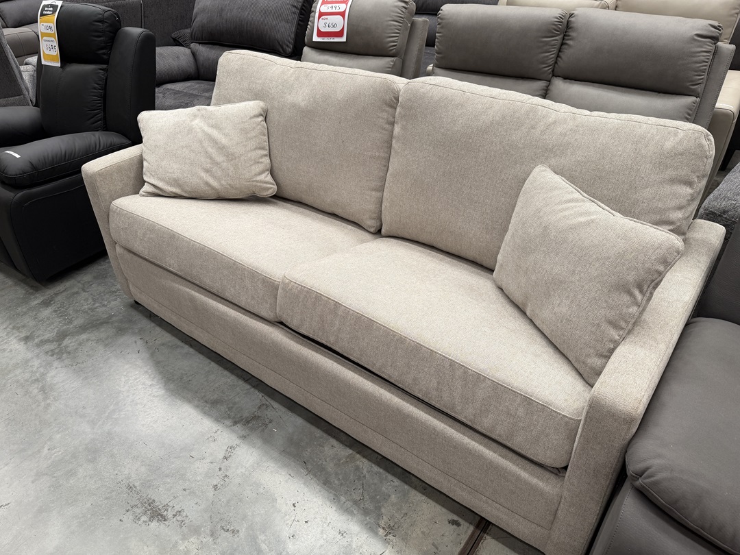 A versatile lounge in soft beige fabric that easily converts into a comfortable sofabed, providing a practical solution for guests and everyday relaxation.