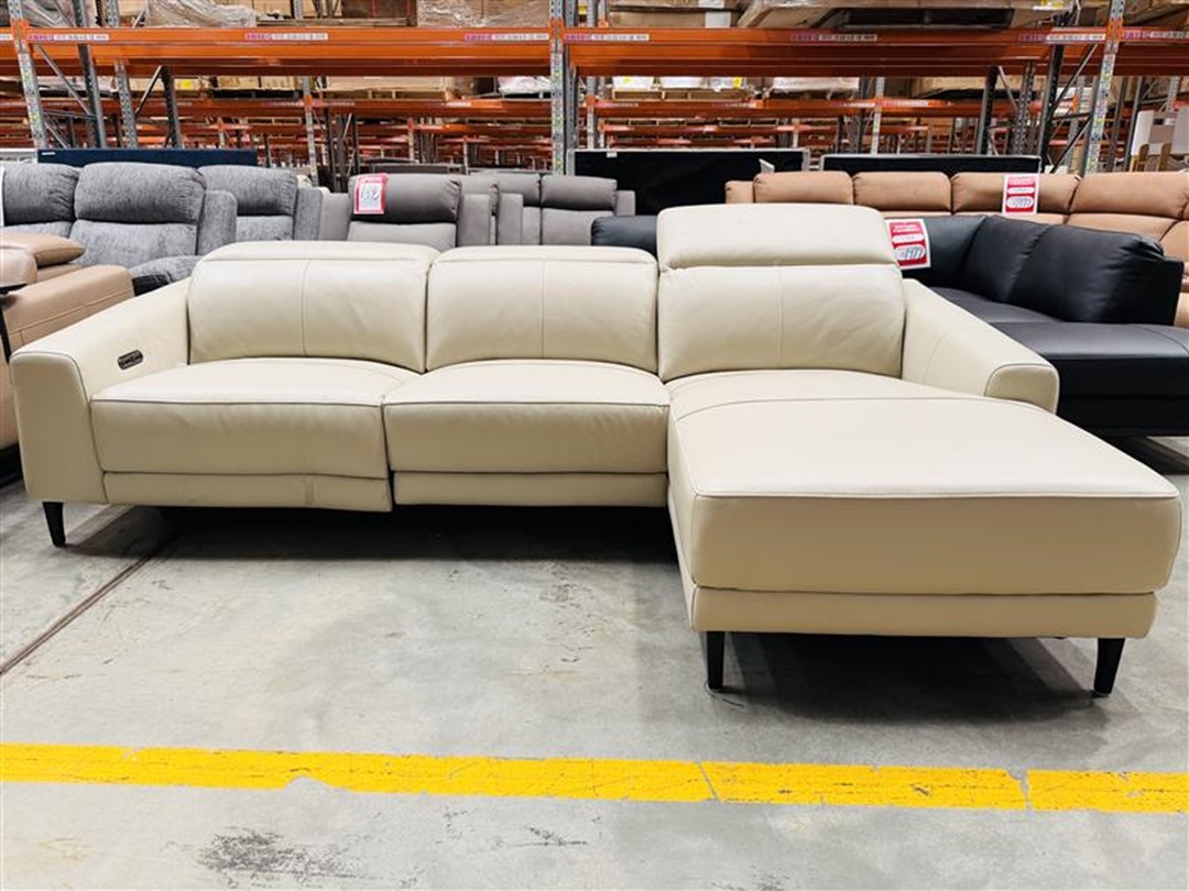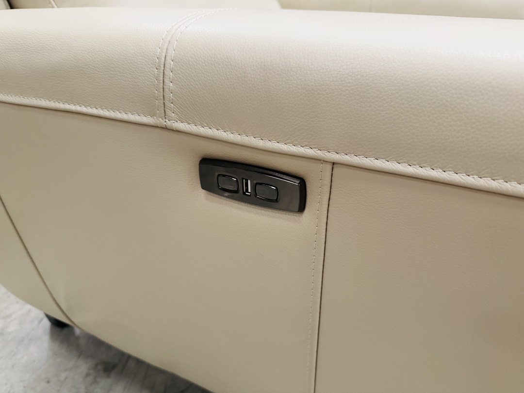 A luxurious 3-piece leather recliner suite in elegant beige. Features smooth electric reclining, adjustable headrests, and built-in USB ports for modern comfort and style in your living space.