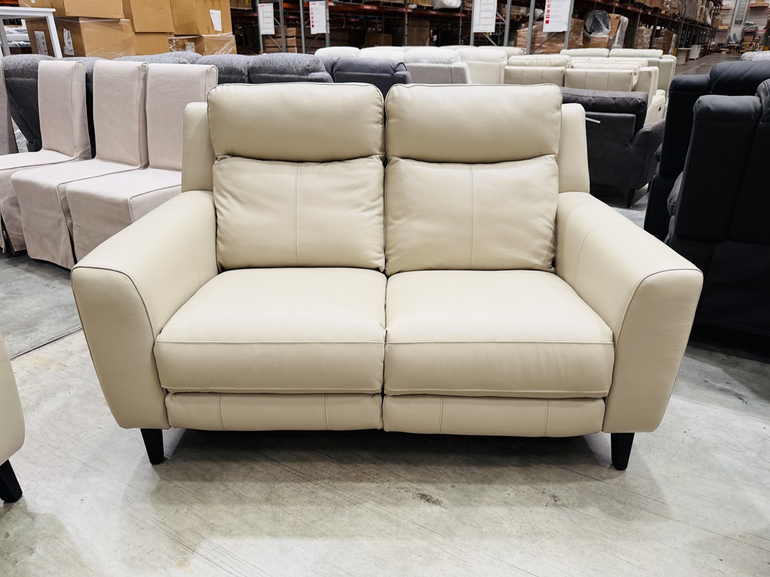 Deep-toned and luxurious, this leather 2-seater offers power reclining functionality for ultimate comfort. Its bold navy hue adds drama and refinement to a space, pairing well with metallic accents & glass tables.