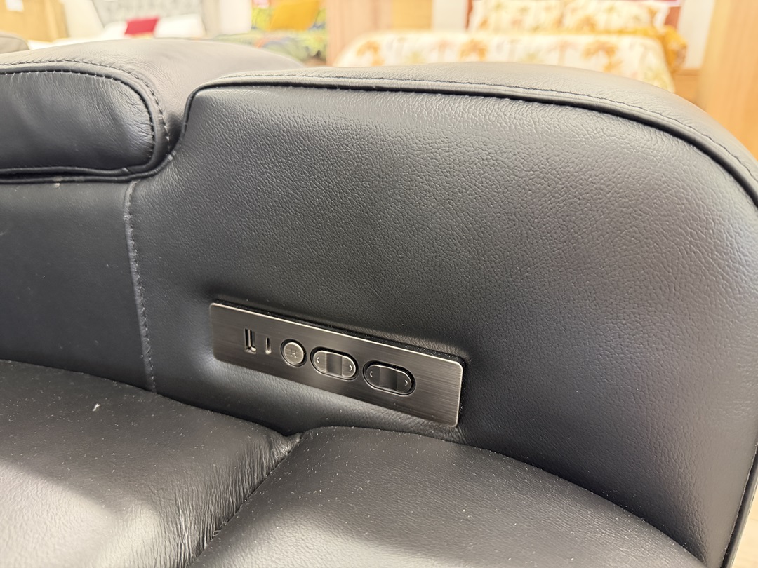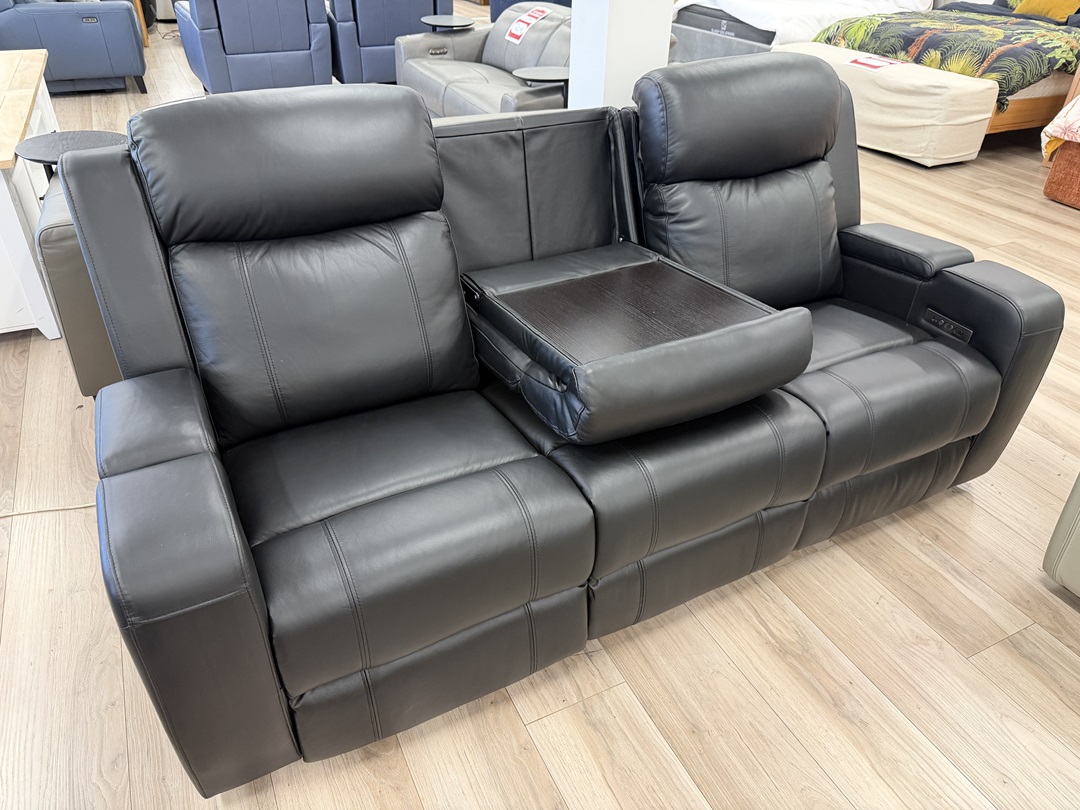 A premium black leather 3 seater sofa designed with electric recliners, built-in USB port, dropdown tray, and hidden storage to deliver advanced comfort and everyday convenience.