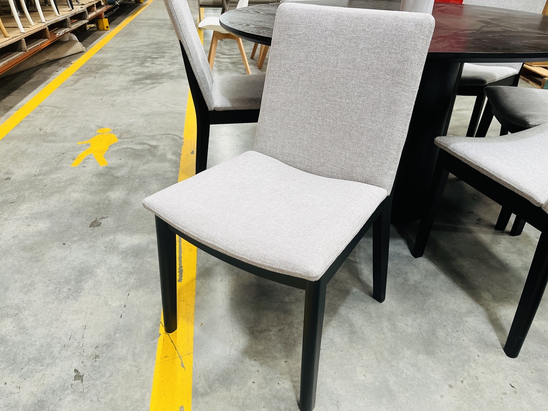 This elegant dining set includes a black timber round table and six grey fabric chairs. The dark finish contrasts beautifully with the soft, neutral seating. A stylish centerpiece for gatherings and meals.