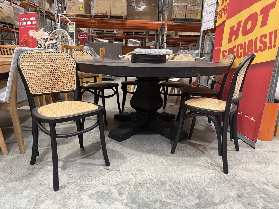A sophisticated round pedestal dining table in black timber paired with six matching chairs to create a modern and classy 7-piece dining setting.