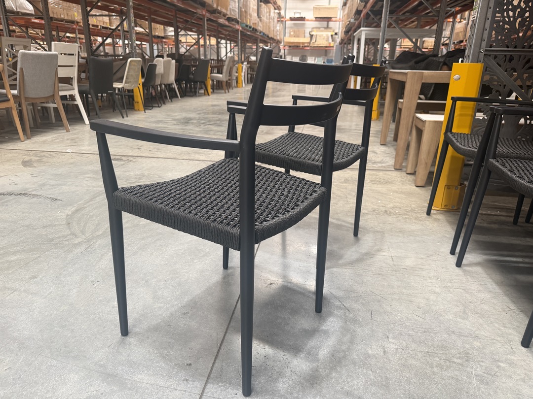 This contemporary dining chair combines a sleek black woven design with a strong metal frame. Offers excellent support and a modern aesthetic. Ideal for adding bold style to any dining room setting.