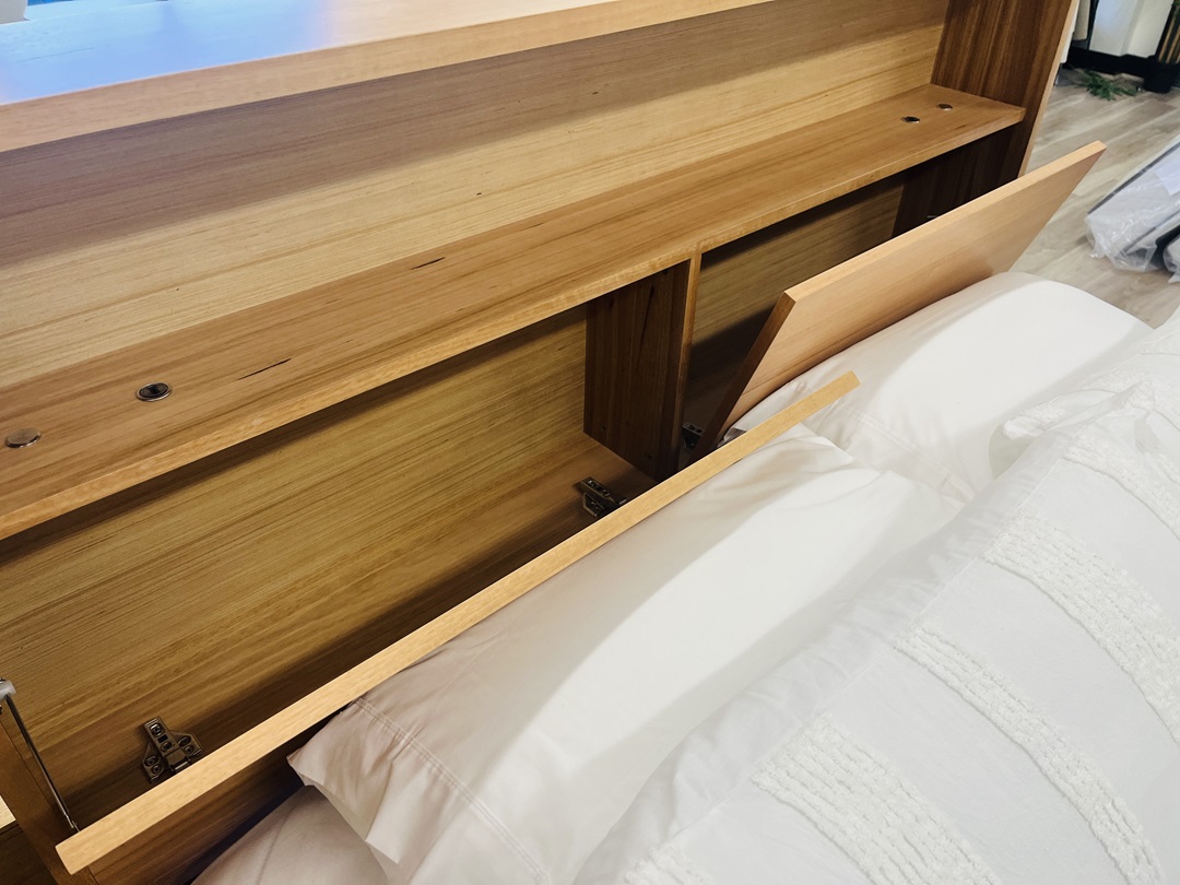 A multifunctional queen bed crafted from blonde timber for a natural finish. Features drawers, storage cabinets, built-in USB ports, and LED lighting for convenience. A complete smart furniture solution blending style with functionality.