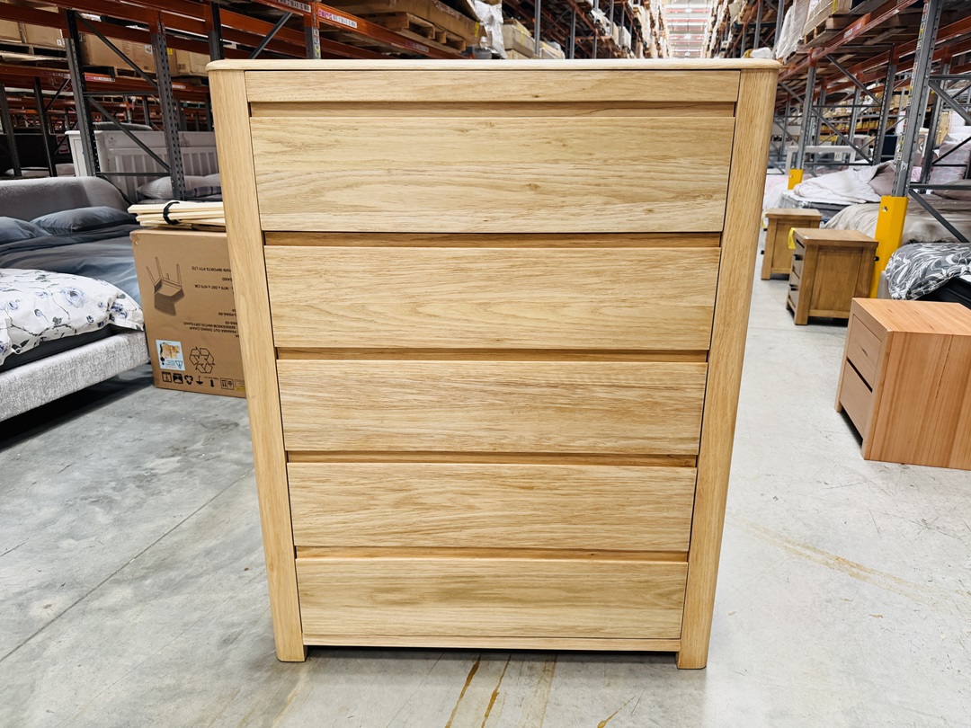 A beautifully crafted rustic tallboy with a warm, natural wood finish. Designed with five deep drawers, this timeless piece blends elegance and functionality, perfect for creating a cozy and organized bedroom space.