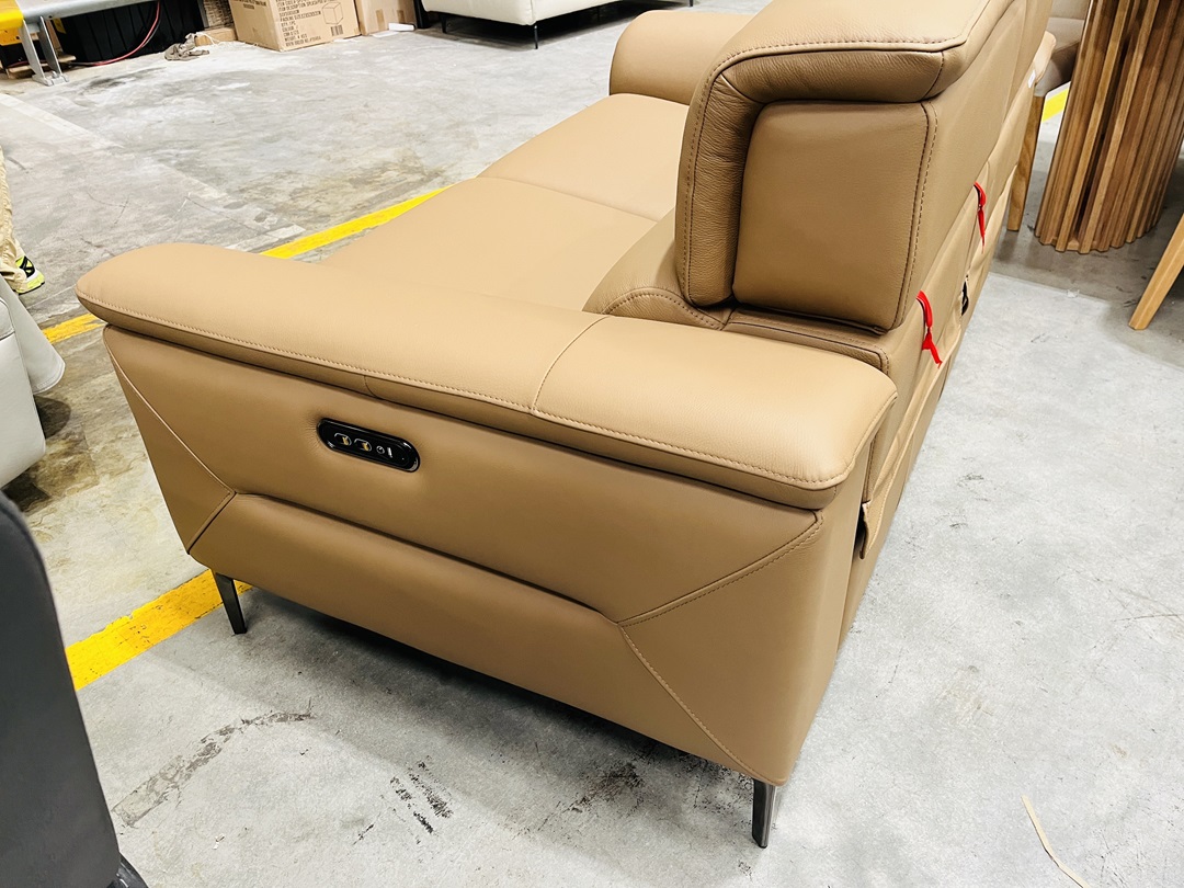 Luxurious brown leather 2-seater sofa with dual electric recliners and adjustable headrests. Offers exceptional comfort and sleek design for a premium lounging experience. Perfect for modern living rooms.