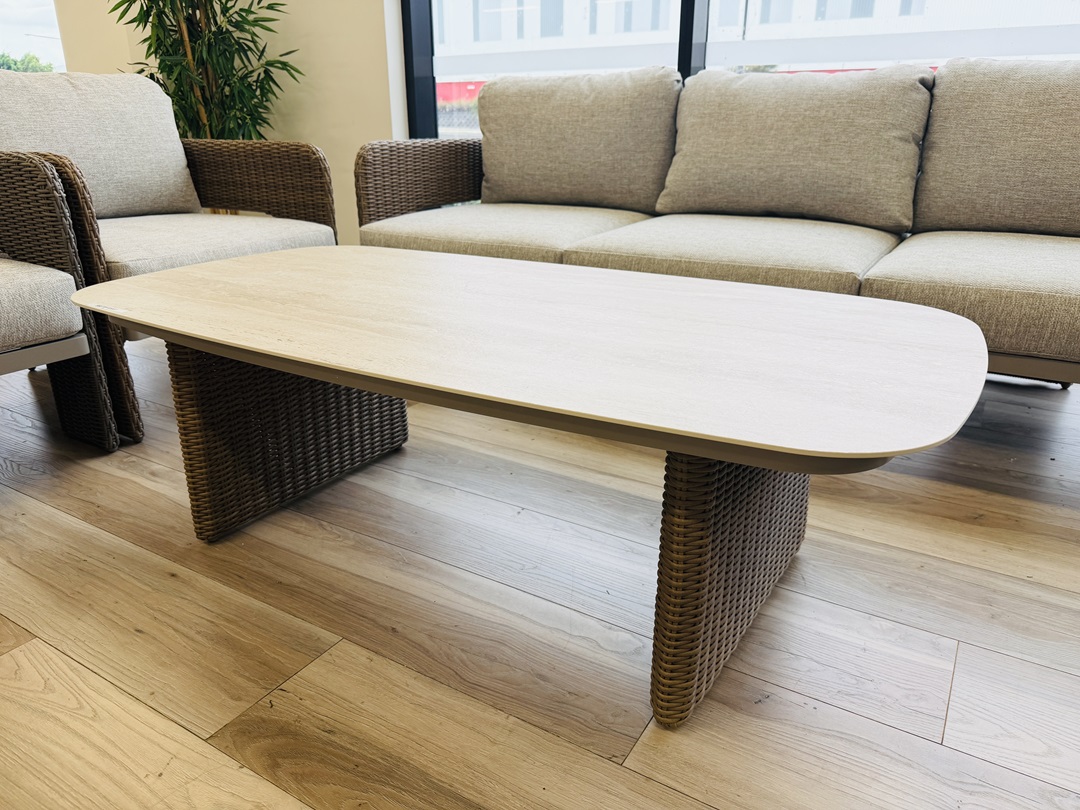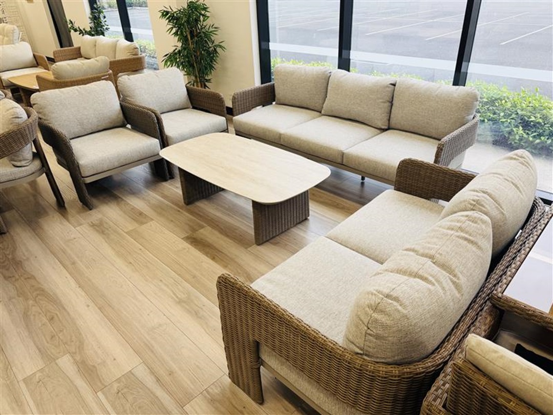 A contemporary outdoor lounge solution with natural textures and a neutral sand tone, perfect for relaxed entertaining.