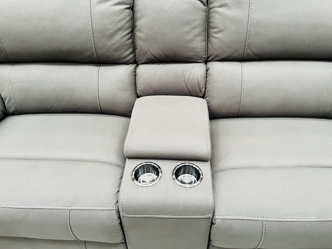 Spacious corner lounge with manual recliners, integrated cupholders, and a hidden storage tray. Upholstered in durable charcoal fabric for comfort and convenience.
