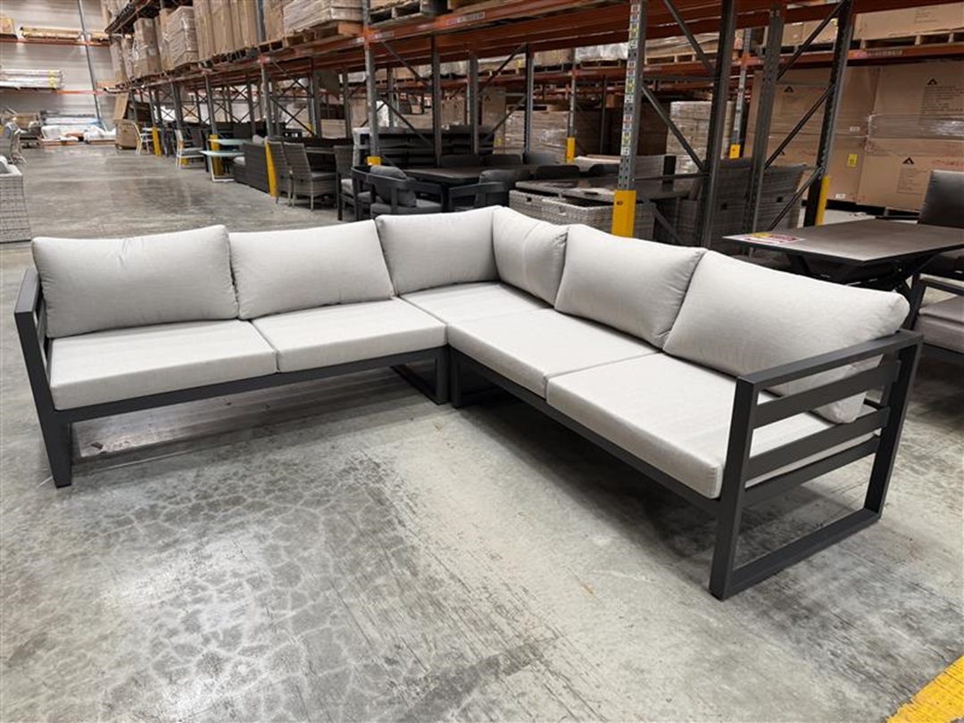 A functional 5-piece outdoor setting featuring a charcoal finish. Combines corner lounge seating with a dining-height table—great for both relaxation and outdoor meals.