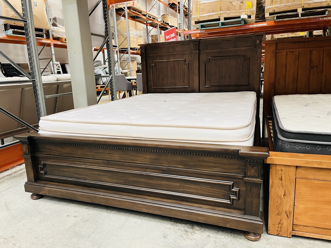 This elegant queen bed features a rich chocolate brown finish for a warm, contemporary look. The package includes a comfortable mattress for added convenience. A perfect blend of comfort, style, and practicality for modern bedrooms.