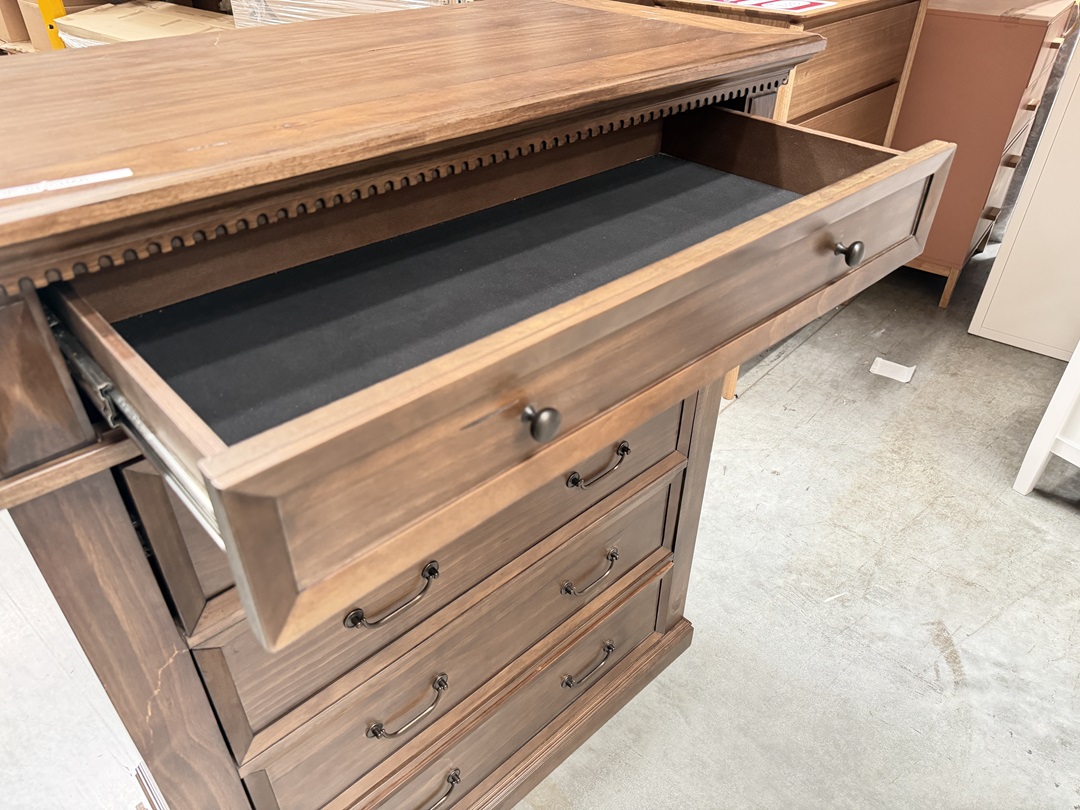 Crafted from rich chocolate-finished timber, this tallboy offers five spacious drawers for all your storage needs. The timeless design and sturdy build add warmth and elegance to your bedroom.