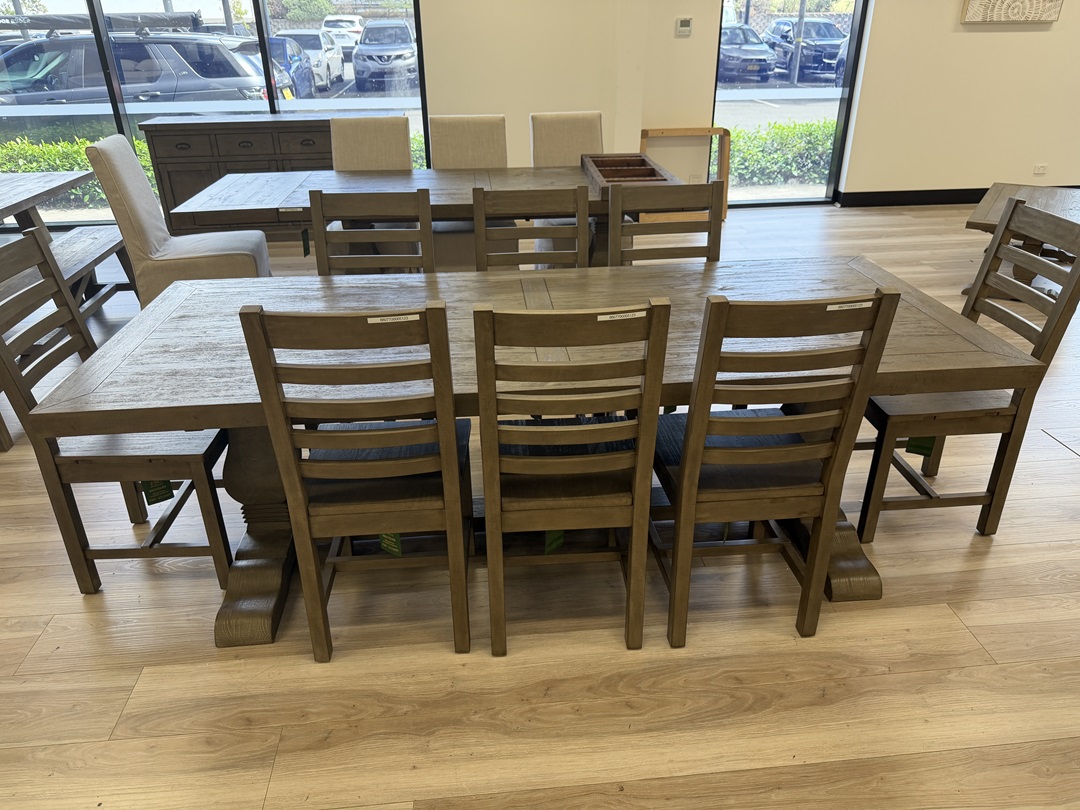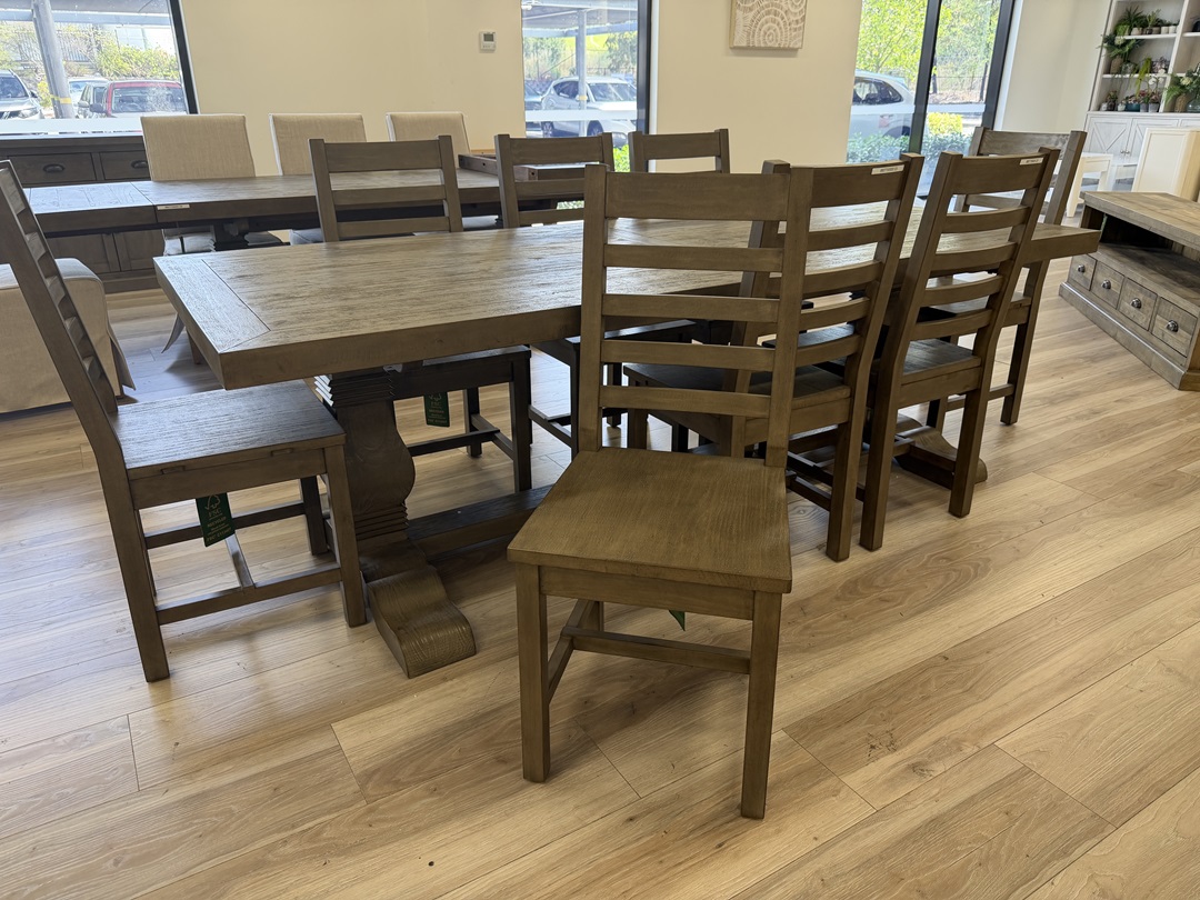 A complete 9-piece dining set in rich chocolate timber, featuring a spacious dining table and eight matching timber chairs. Strong, elegant, and perfect for large family gatherings.