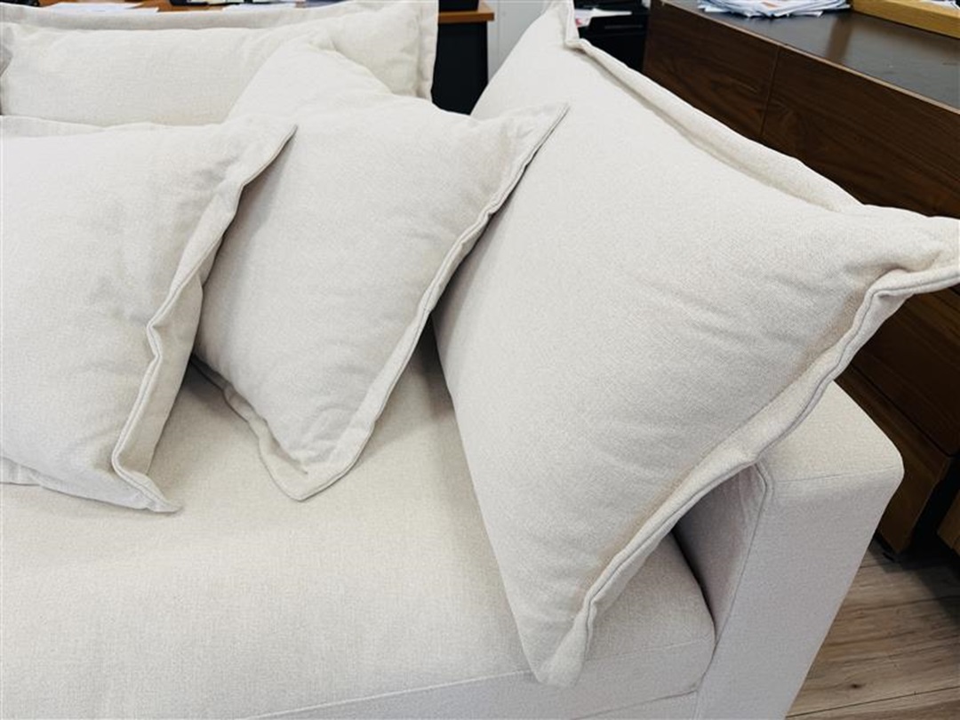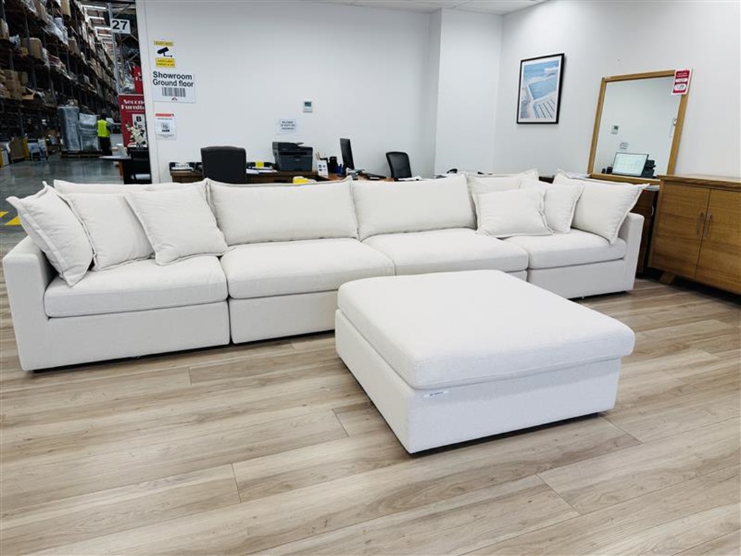 A spacious and inviting 4-seater sofa upholstered in soft cream fabric. Includes a movable ottoman that allows flexible seating arrangements and added comfort. Perfect for modern living rooms seeking both style and versatility.